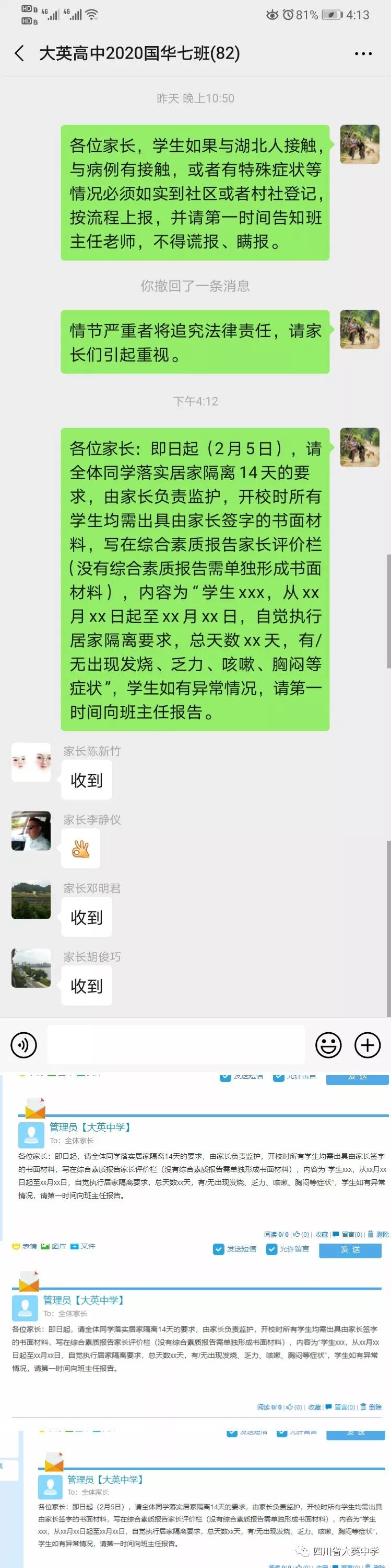 學(xué)校和年級每天通過優(yōu)課優(yōu)信平臺、微信群、QQ群向教師、家長、學(xué)生推送防疫知識、防控信息、加強宣傳教育,并在學(xué)校門口設(shè)置疫情防控宣傳點。