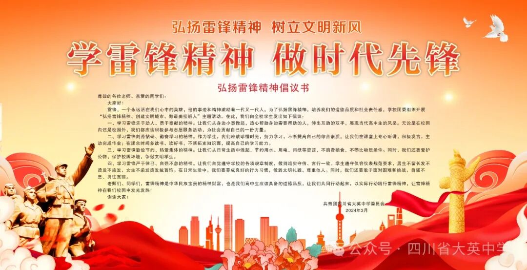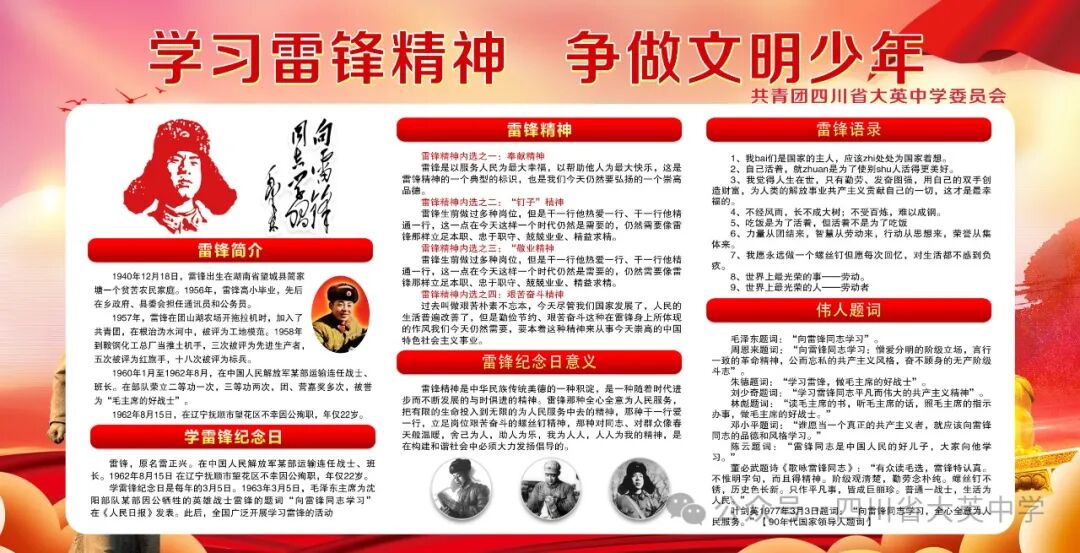 為深入學習貫徹習近平總書記關于弘揚雷鋒精神的重要論述,傳承和弘揚雷鋒精神,弘揚“奉獻、友愛、互助、進步”的志愿精神,在第61個雷鋒紀念日期間,大英中學團委積極開展“弘揚雷鋒精神、創(chuàng)建文明城市、做最美接班人”主題系列活動。