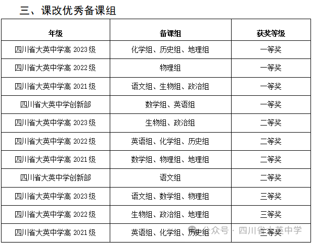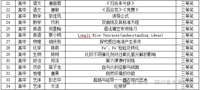 本次比賽各年級積極組織老師參與,根據(jù)獻(xiàn)課比賽獲獎情況和各年級比賽組織情況評選出課改優(yōu)秀備課組和課改優(yōu)秀年級,獲獎情況如下: