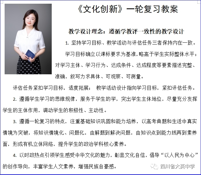 評委們對參賽的7份教學(xué)設(shè)計進行嚴格評議,獲得最高分的是文鳳老師的教學(xué)設(shè)計《文化創(chuàng)新》。