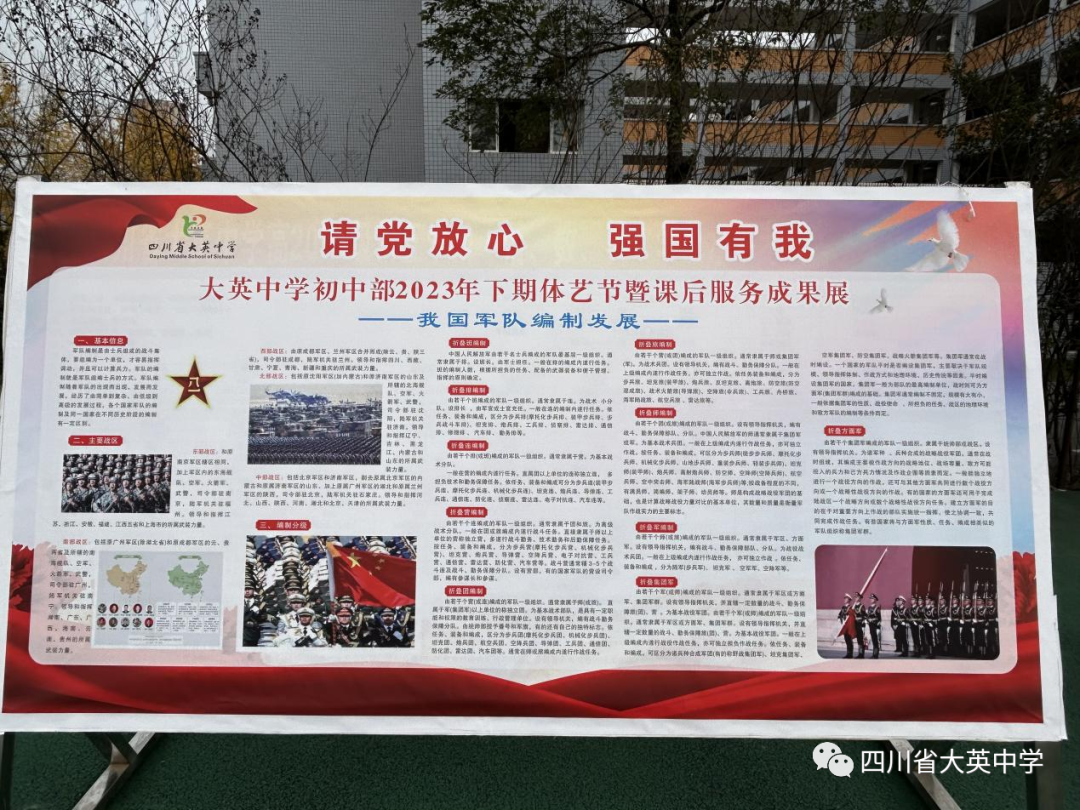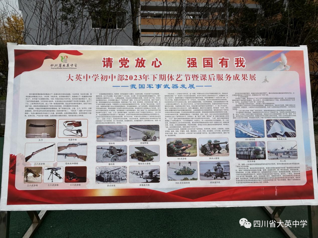 為落實立德樹人根本任務,推行“五育并舉”的育人體系,促進學生全面發(fā)展,引導學生厚植家國情懷、堅定理想信念,12月7日—8日,大英中學初中部開展了以“請黨放心,強國有我”為主題的體藝節(jié)暨課后服務成果展。本次活動分為“請黨放心,強國有我之我就是戰(zhàn)士的親子活動”“請黨放心,強國有我之我就是運動健將的競技運動會”“請黨放心,強國有我之我就是生活達人趣味項目展”三個部分。