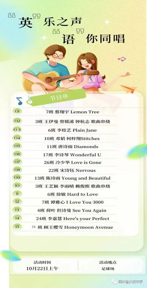 為貫徹落實英語核心素養(yǎng)要求,營造良好的英語學習氛圍,激發(fā)學生學習英語的興趣,培養(yǎng)學生“說”“唱”“演”的能力,感悟英語文化的魅力,我校高2022級英語組于2023年10月22日成功舉辦“英樂之聲,語你同唱”主題英語歌唱比賽。