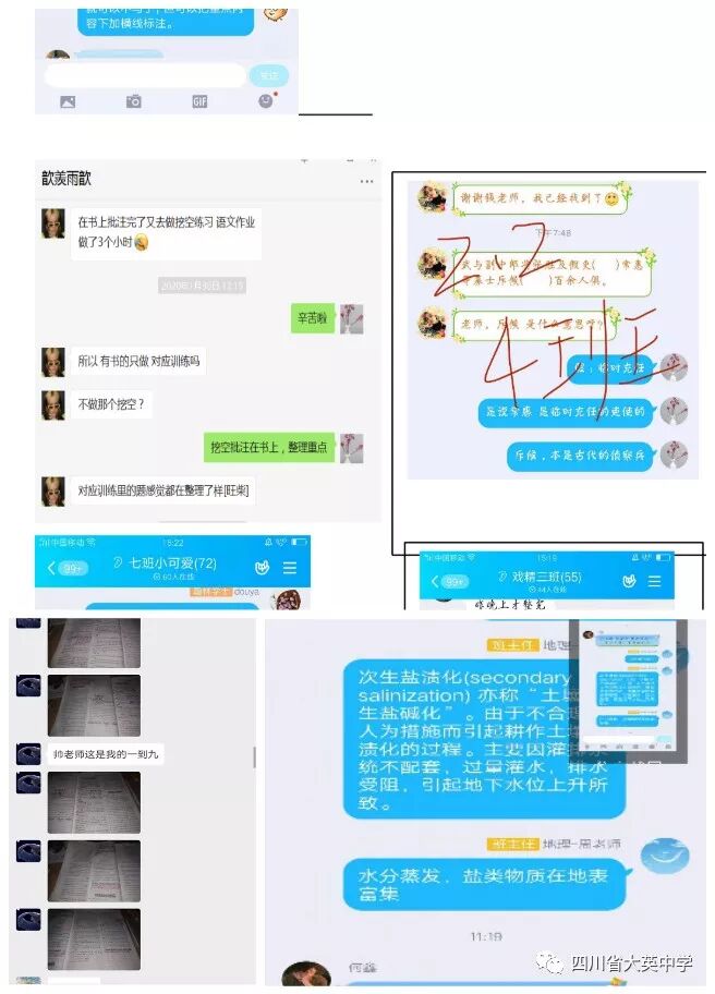 各班以4—6人建立小組合作群,組員上傳完成作業(yè)的圖片,組長檢查學(xué)生完成情況及自主更正情況,并于每天上午、下午、晚上定時向班主任匯報。