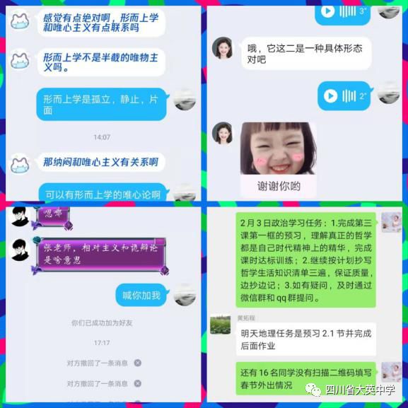 為了保障每位學(xué)生“停學(xué)不停課”,學(xué)校要求每個班級建立班級微信群或QQ群,班主任為群主,任課教師和學(xué)生全部進(jìn)群,及時普及疫情防控知識,指導(dǎo)完成寒假作業(yè),做好在線答疑。為學(xué)生推薦免費(fèi)學(xué)習(xí)網(wǎng)站、云課堂、電子課程,充分利用網(wǎng)上學(xué)習(xí)資源,布置任務(wù)。