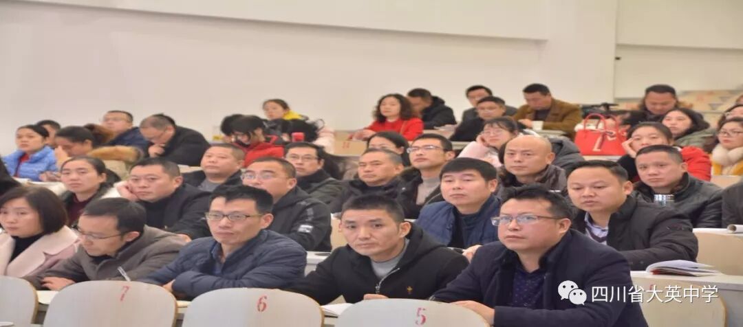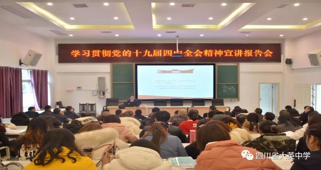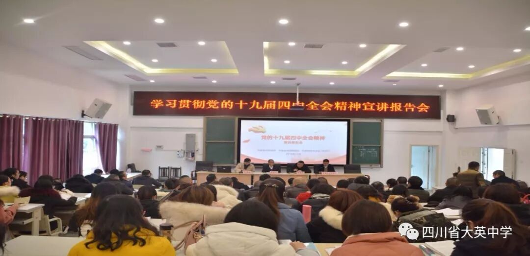 12月4日下午,在大英中學(xué)慧達(dá)樓階梯教室舉行了學(xué)習(xí)貫徹黨的十九屆四中全會(huì)精神宣講報(bào)告會(huì)。遂寧市委宣講團(tuán)第五分團(tuán)成員、市委宣傳部副部長(zhǎng)蔣世興同志作宣講報(bào)告。縣委宣傳部副部長(zhǎng)徐其柱、大英縣教體局黨組書(shū)記廖福金陪同參加會(huì)議。大英中學(xué)全體行政領(lǐng)導(dǎo)及黨員教師、大英縣實(shí)驗(yàn)學(xué)校、蓬萊小學(xué)、蓬萊中學(xué)、郪江外國(guó)語(yǔ)學(xué)校、育才中學(xué)等縣城學(xué)校的部分領(lǐng)導(dǎo)現(xiàn)場(chǎng)聆聽(tīng)報(bào)告。宣講會(huì)由大英中學(xué)校長(zhǎng)李隆全主持。