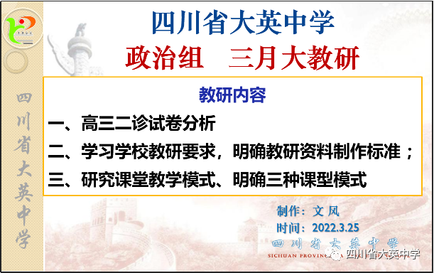 本次研討活動(dòng)是高中政治組本學(xué)期第二次集體教研。活動(dòng)主要圍繞分析遂寧二診試卷、學(xué)習(xí)學(xué)校教研要求、研究課堂教學(xué)模式開展。