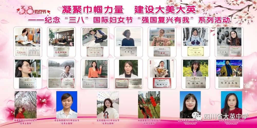 “最美人間三月天,春風(fēng)含笑柳如煙?!痹诘?12個“三八”國際婦女節(jié)到來之際,為豐富廣大女教職工的精神生活,增加職業(yè)幸福感,四川省大英中學(xué)營造“喜迎二十大,一起向未來”節(jié)日氛圍,開展了以“強國復(fù)興有我,巾幗筑夢芳華”為主題的系列慶?;顒?,激勵全校女教職工積極投身教育事業(yè),為大英“四美”共建貢獻力量,向即將召開的黨的二十大獻禮。