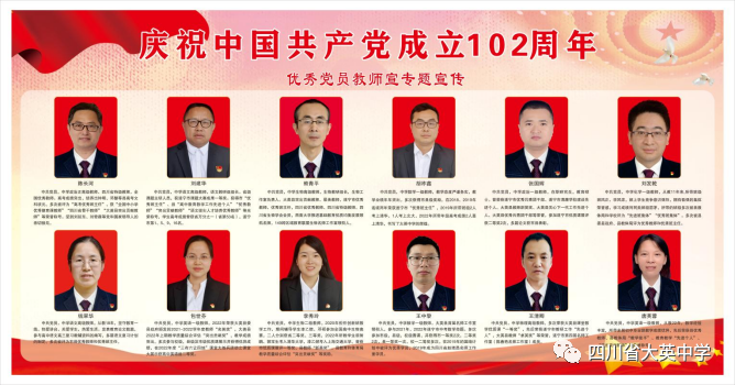 為深入學習貫徹習近平新時代中國特色社會主義思想和黨的二十大精神,實現大英 “三個為榮”的教育愿景,近日,在中國共產黨成立102周年之際,大英中學黨委舉辦了“黨徽在閃耀,黨員展風采”系列主題活動,弘揚偉大建黨精神,表達愛黨愛國情懷,祝賀偉大的中國共產黨生日快樂!