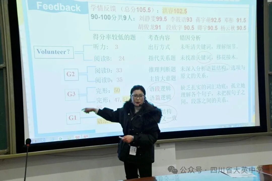 課堂展示中,老師們巧妙設(shè)計問題,精準(zhǔn)分析考點,有效調(diào)動學(xué)生的積極性,順利突破本課的重難點。課堂高效靈動、教者引導(dǎo)到位、師生互動充分,充分展現(xiàn)了我校的復(fù)習(xí)課堂模式,詮釋了四川省大英中學(xué)的教學(xué)成果,展示了四川省大英中學(xué)的育人使命擔(dān)當(dāng)。