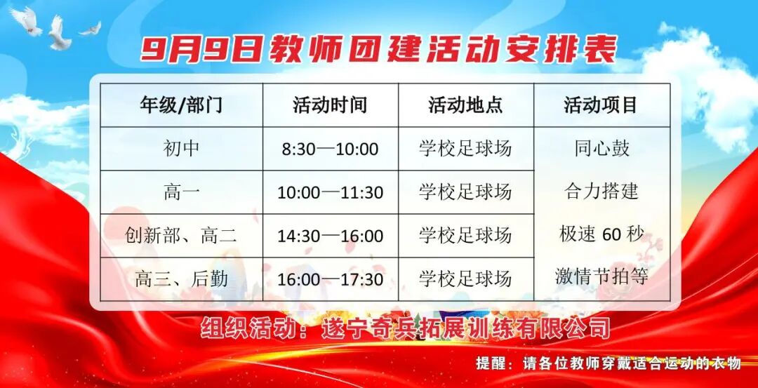 凝心聚力,攜手同行。為增強(qiáng)教職員工團(tuán)隊(duì)凝聚力和向心力,提升教師的幸福感和歸屬感,營(yíng)造積極向上、和諧溫馨的校園文化氛圍,9月9日,開展慶?;顒?dòng)的重頭戲:別開生面的教師團(tuán)隊(duì)建設(shè)活動(dòng)。