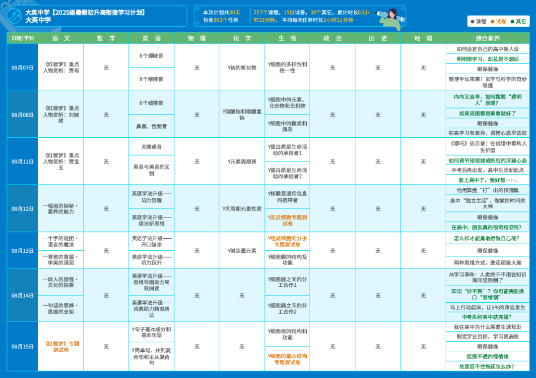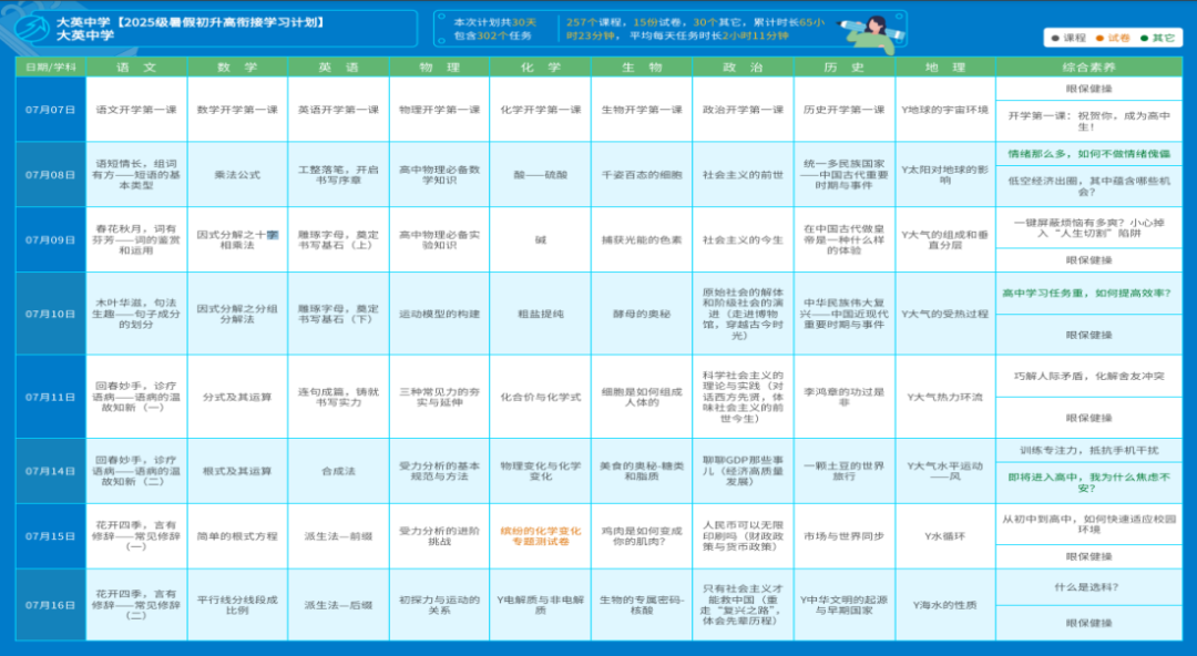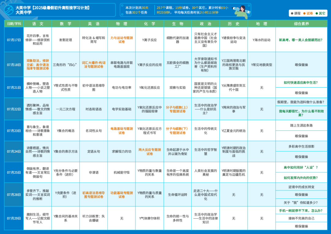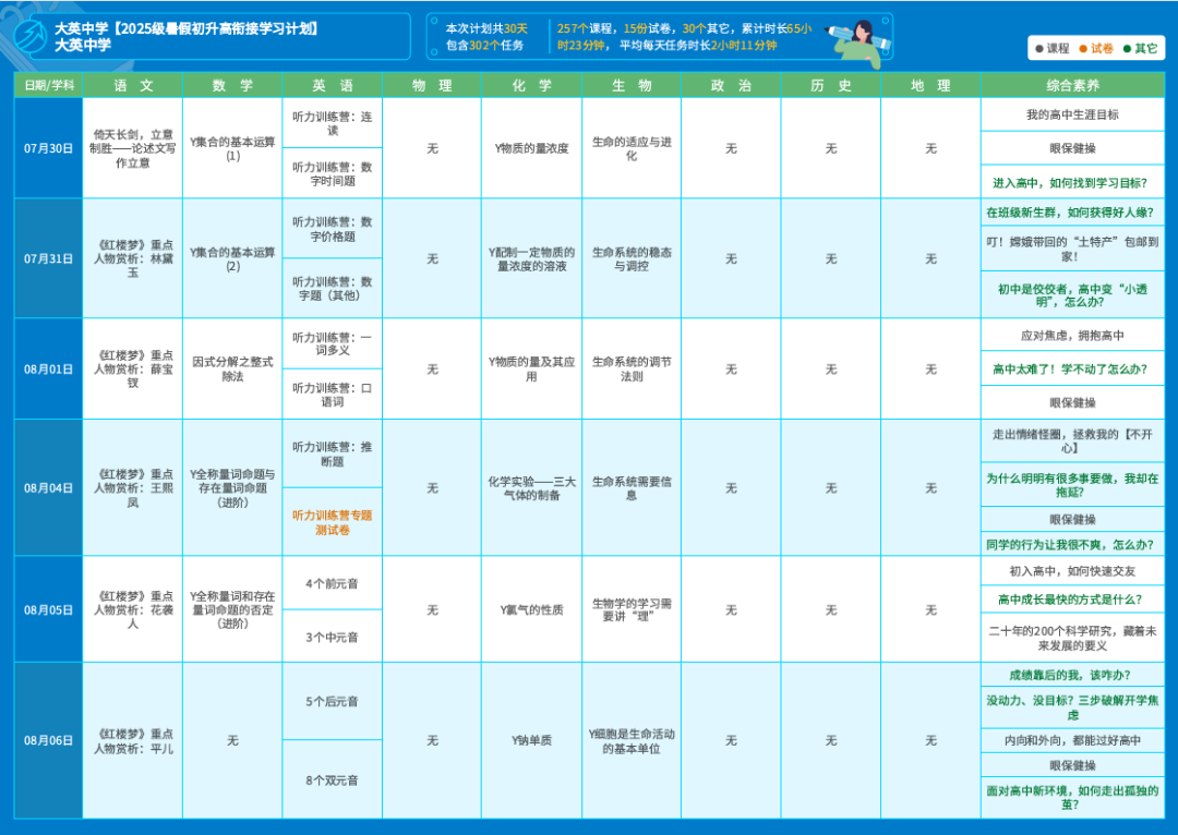 學(xué)校高度重視新生初升高銜接,提前制定“四川省大英中學(xué)2025級(jí)新生暑期30天學(xué)習(xí)計(jì)劃”,內(nèi)容涵蓋開(kāi)學(xué)第一課、高中學(xué)習(xí)方法適應(yīng)、高中心態(tài)調(diào)整、高中生涯規(guī)劃、假期活動(dòng)等,豐富多樣,滿足家長(zhǎng)和同學(xué)們的學(xué)習(xí)需求。